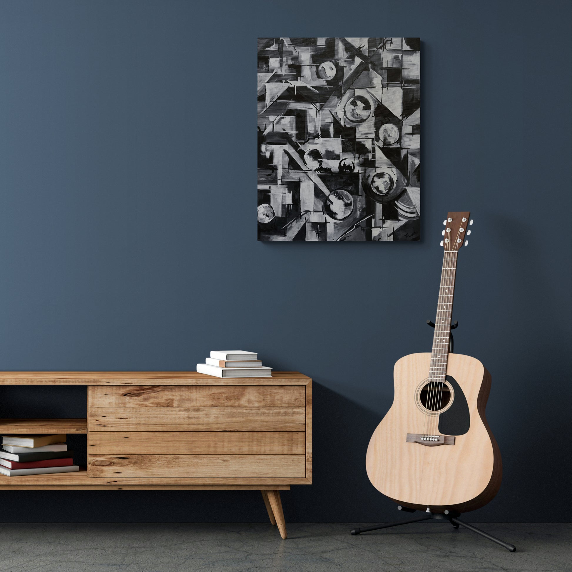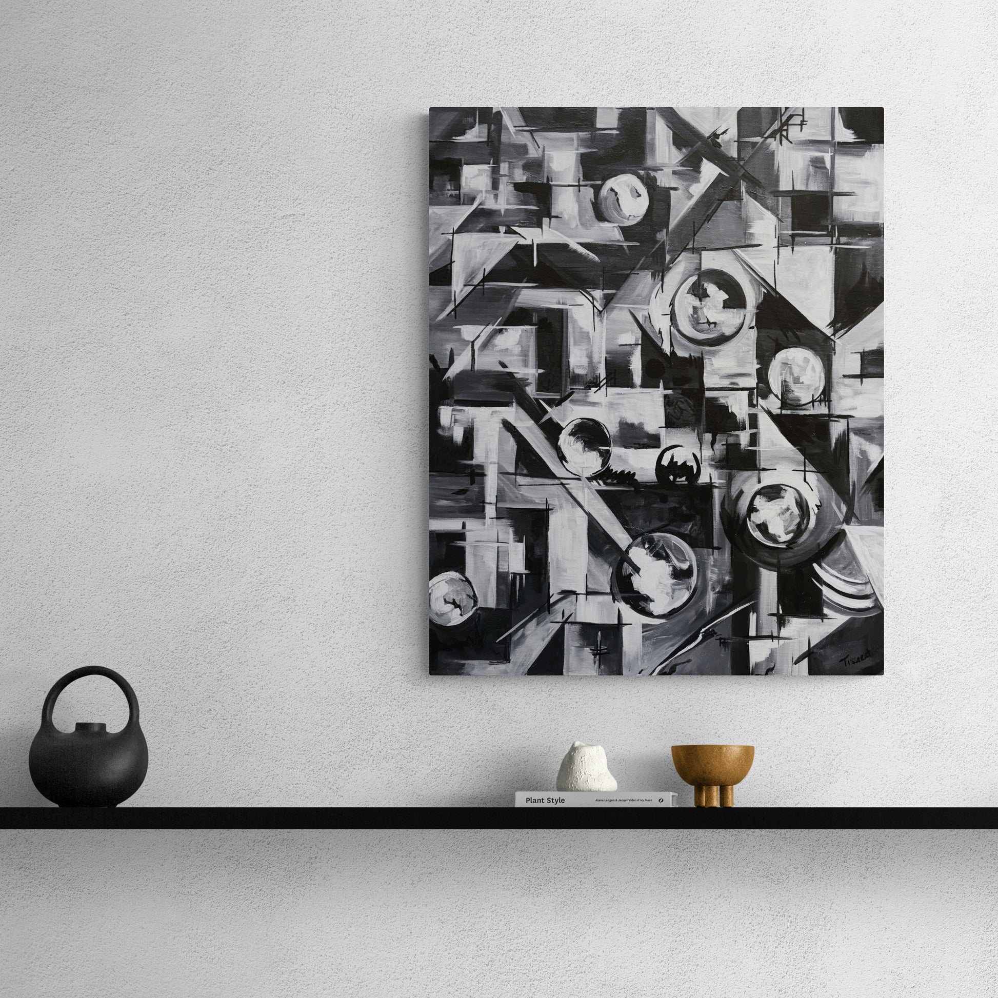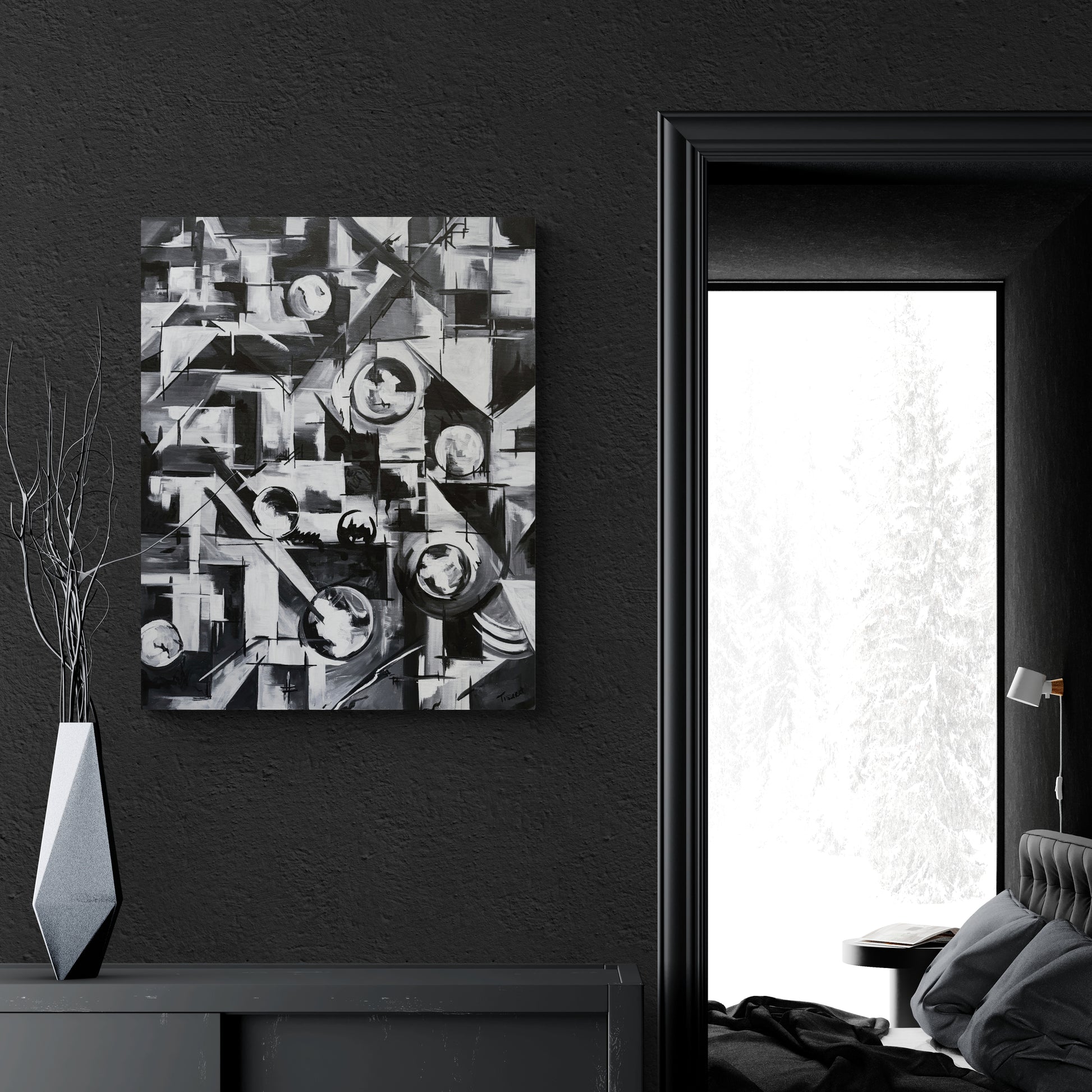 "Noir" by Teresa Tisserat is a black-and-white abstract painting whose shapes, lines and grayscale shades allow viewers to experience and identify different perspectives, emotions and memories.